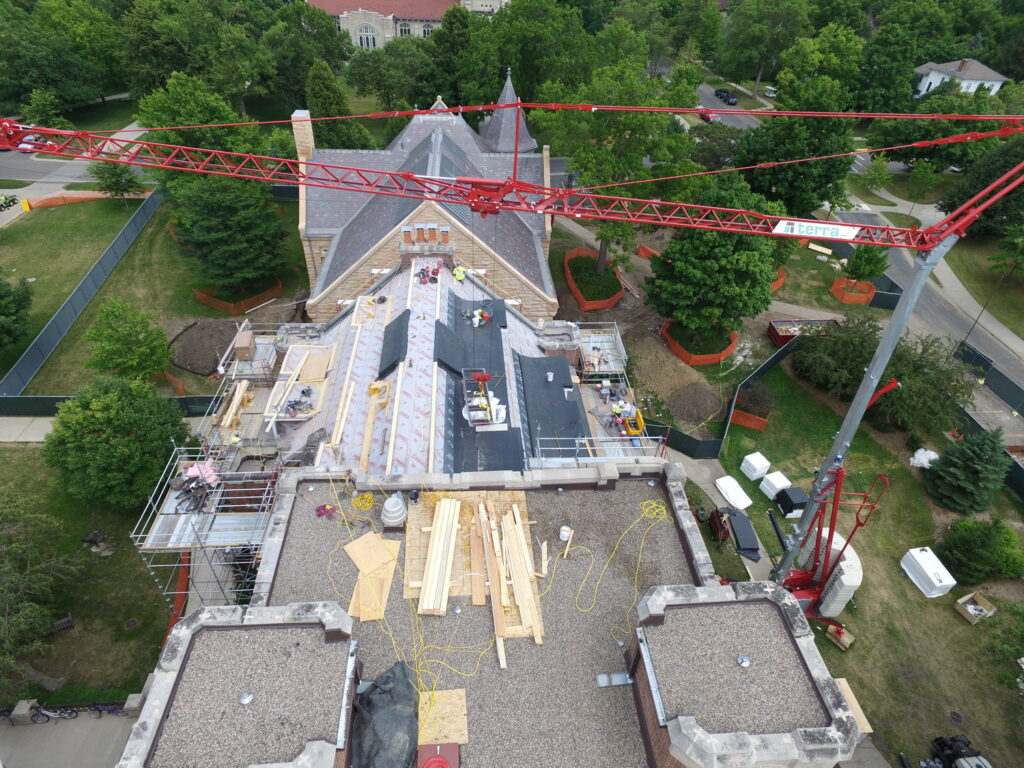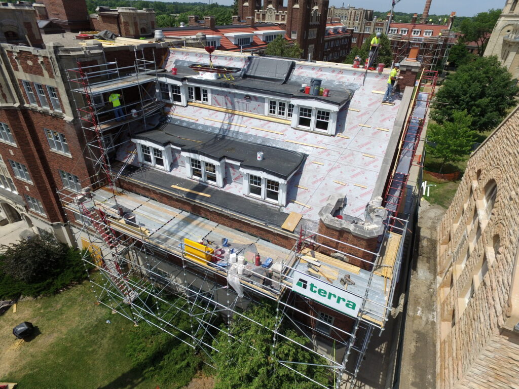 This project included a full removal of the existing membrane, base flashing, sheet metal flashings and all remnants of the original roof. Upon completion of removal, the existing deck was examined and any deterioration or deficiencies were completed and a complete new EPDM roof system was installed. A portion of the roof included removing existing flat soldered seam panels and installing new underlayment and new soldered flat seam copper and gutters to match the existing building. In addition to roofing, the scope also included re-pointing the interior side of the gable parapet walls and the interior turret parapet walls along with replacing dormer windows, chimney repairs and stone cap restoration.