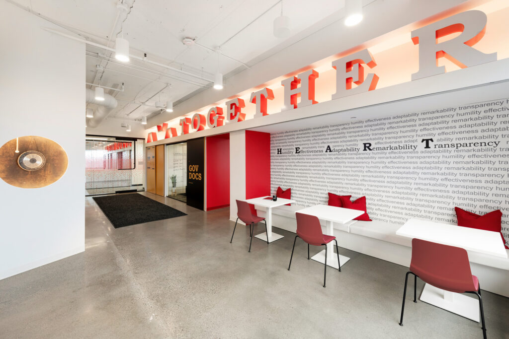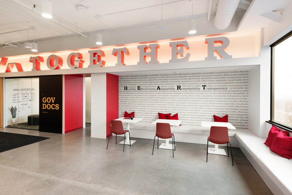 This project involved the 14,221 sf remodel of GovDocs office in Eagan, Minnesota. Work included reception area, offices, open workstations, collaboration spaces, focus rooms, conference rooms and café.
