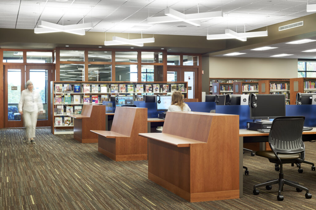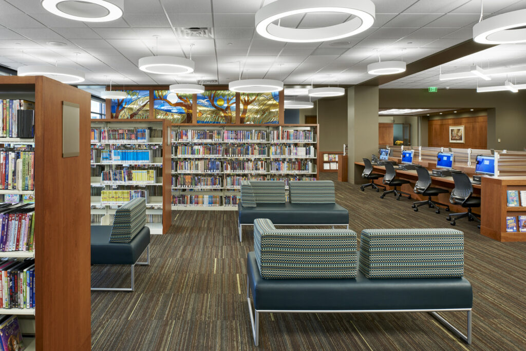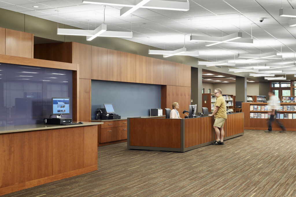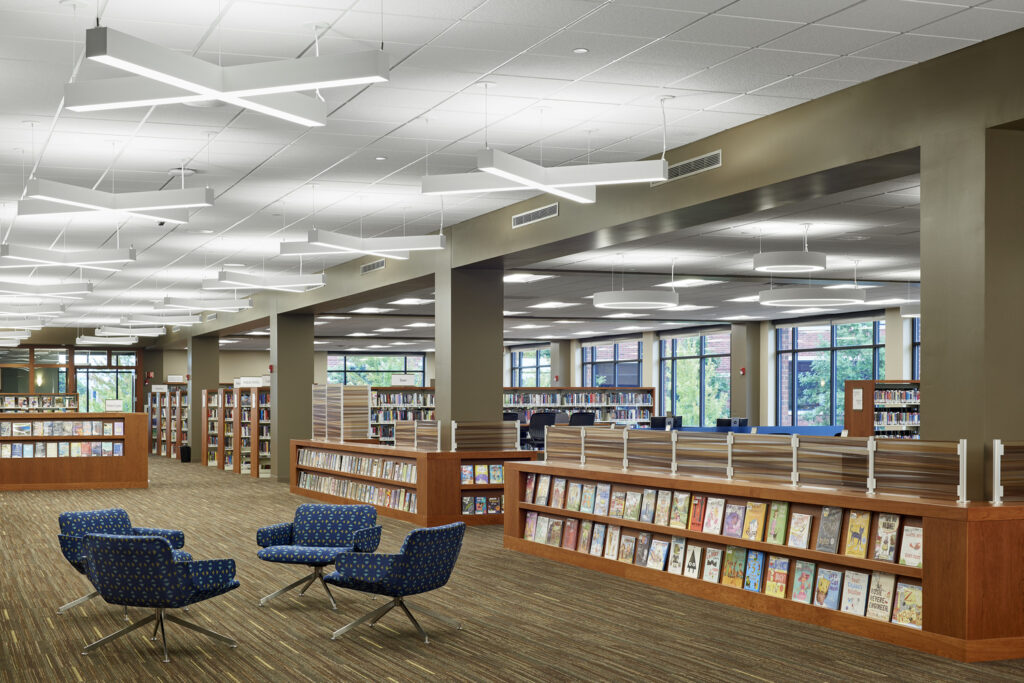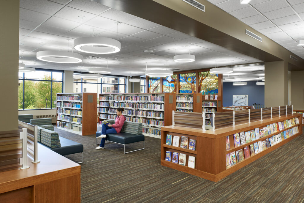 This project included the interior remodeling of the Hennepin County Edina Library, located on the upper level of a 2-story building. The project scope involved creating lighter, more comfortable spaces with improved acoustics, an enclosed reading room, collaborative working spaces and a larger children’s area with interactive learning elements. New automated material handling equipment and a workroom reconfiguration were improvements to behind-the-scenes efficiency. Exterior modifications were minor and included a new automated bookdrop.
