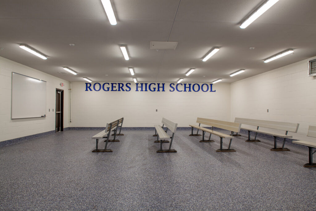 This project included the construction of three new buildings at the Rogers High School Stadium. The first building was a 3,496 sf facility to house a food preparation area, concessions, ticket sales, officials' office, public restrooms and storage. The remaining two buildings were identical 2,577 sf facilities built to include storage and locker rooms - one building for the home team, the other for visitors. These updated athletic/activity spaces were completed to meet State and District standards.