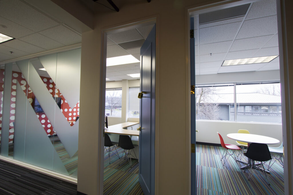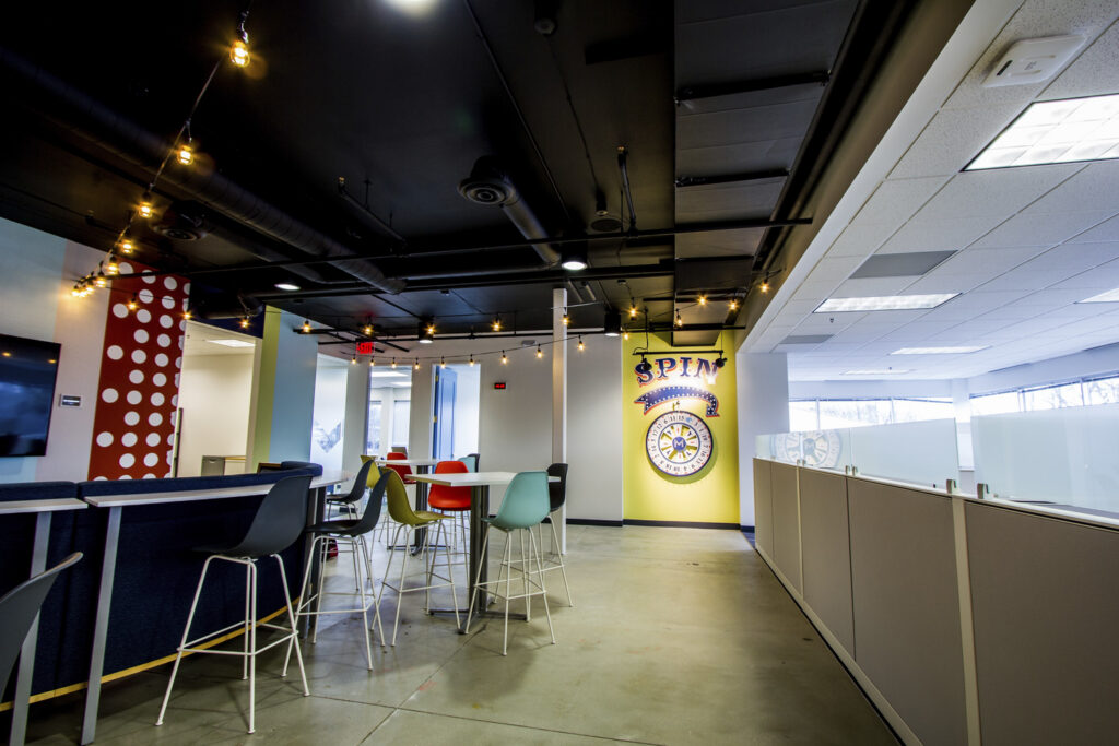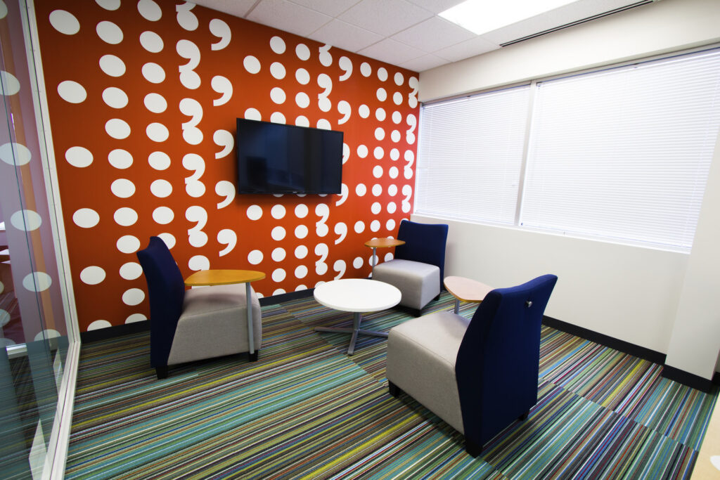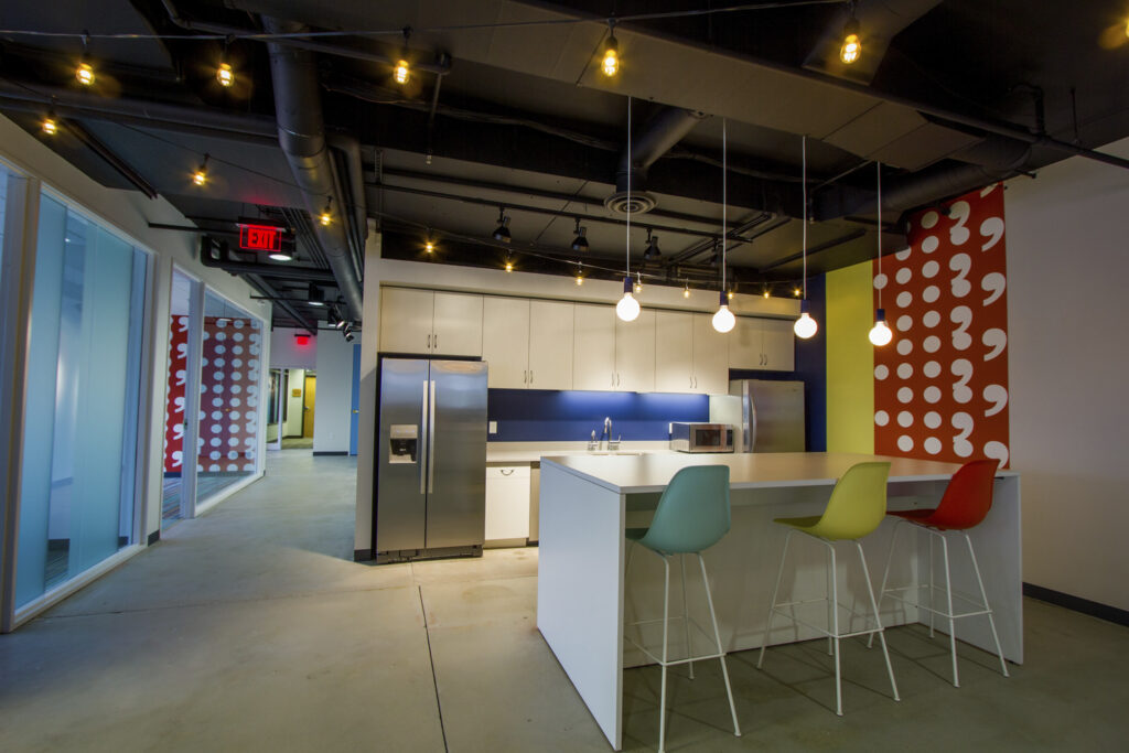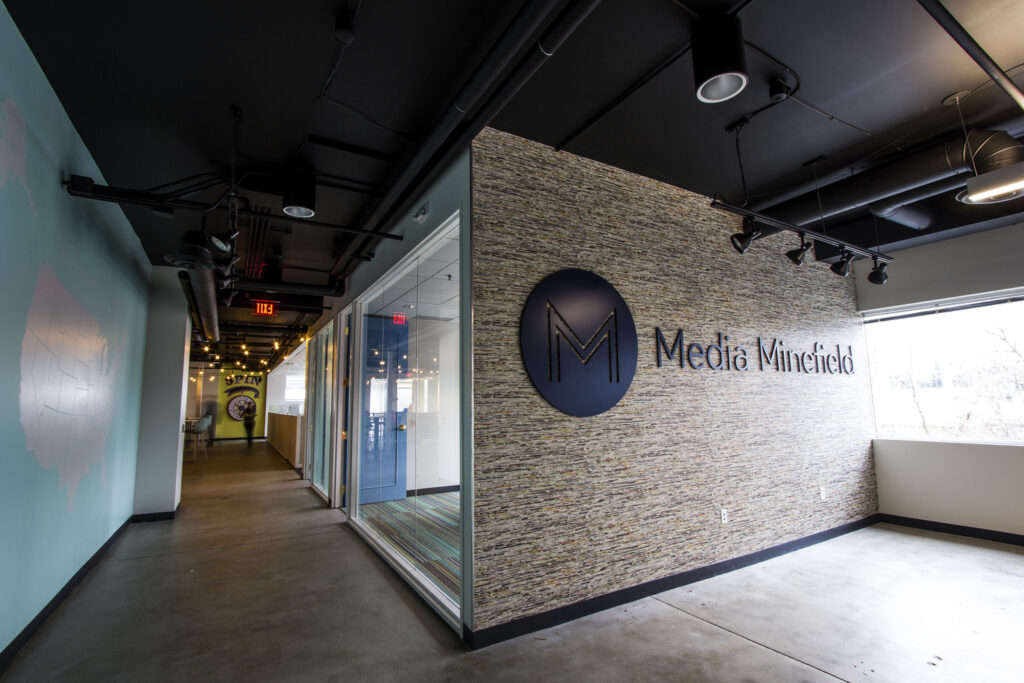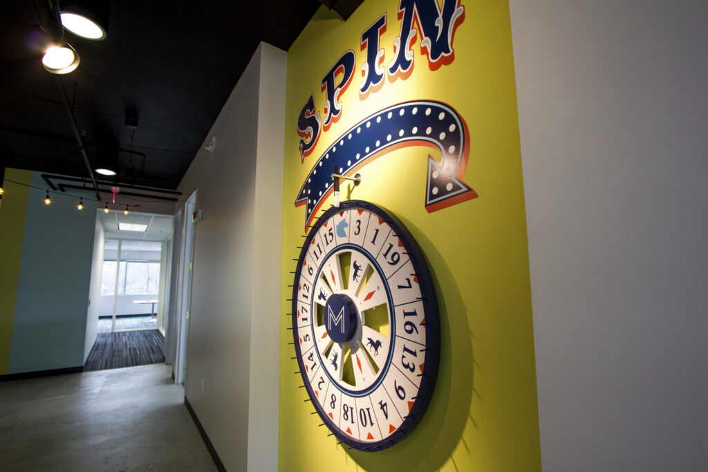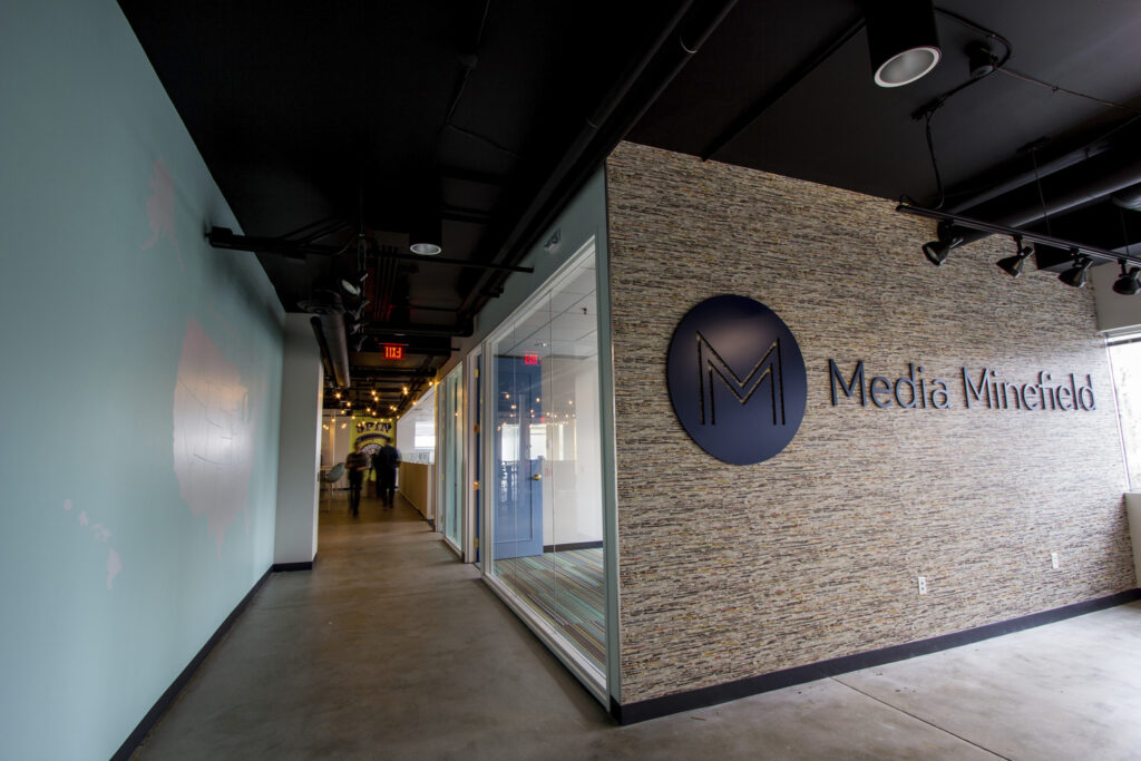 This project involved the construction of the new headquarters for Media Minefield, a public relations company who helps clients get news coverage and prepares them for media appearances. Work included a kitchen, breakroom, glass-walled executive offices, collaborative meeting spaces and a prize wheel wall.