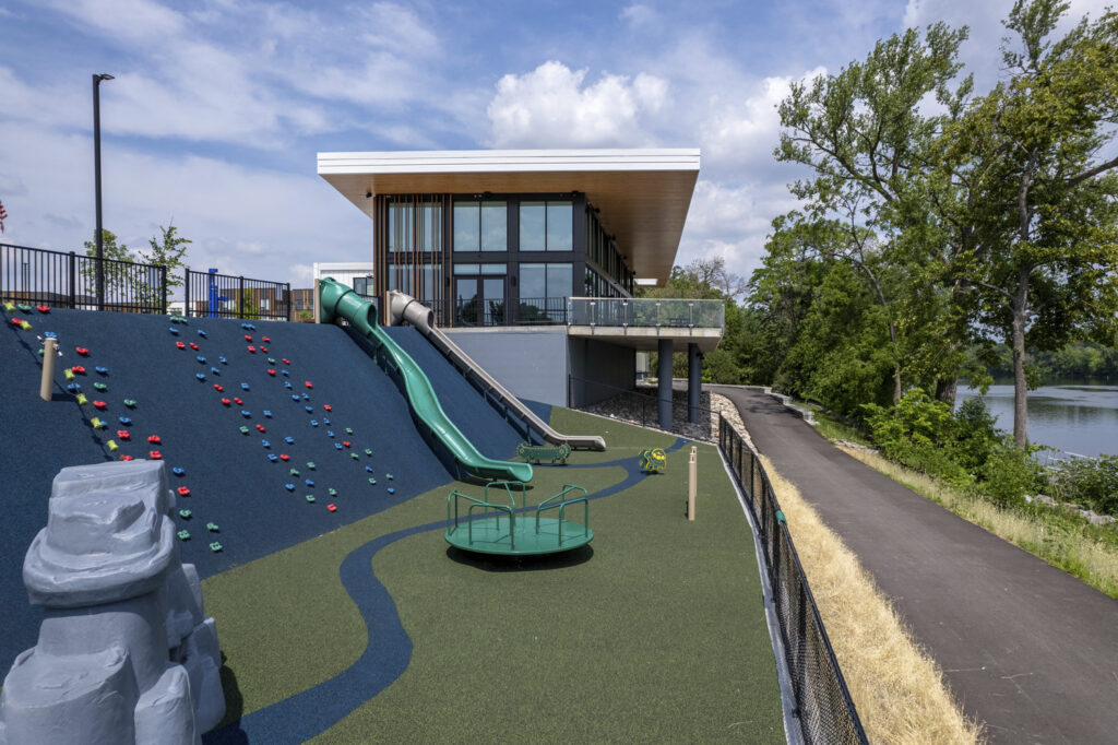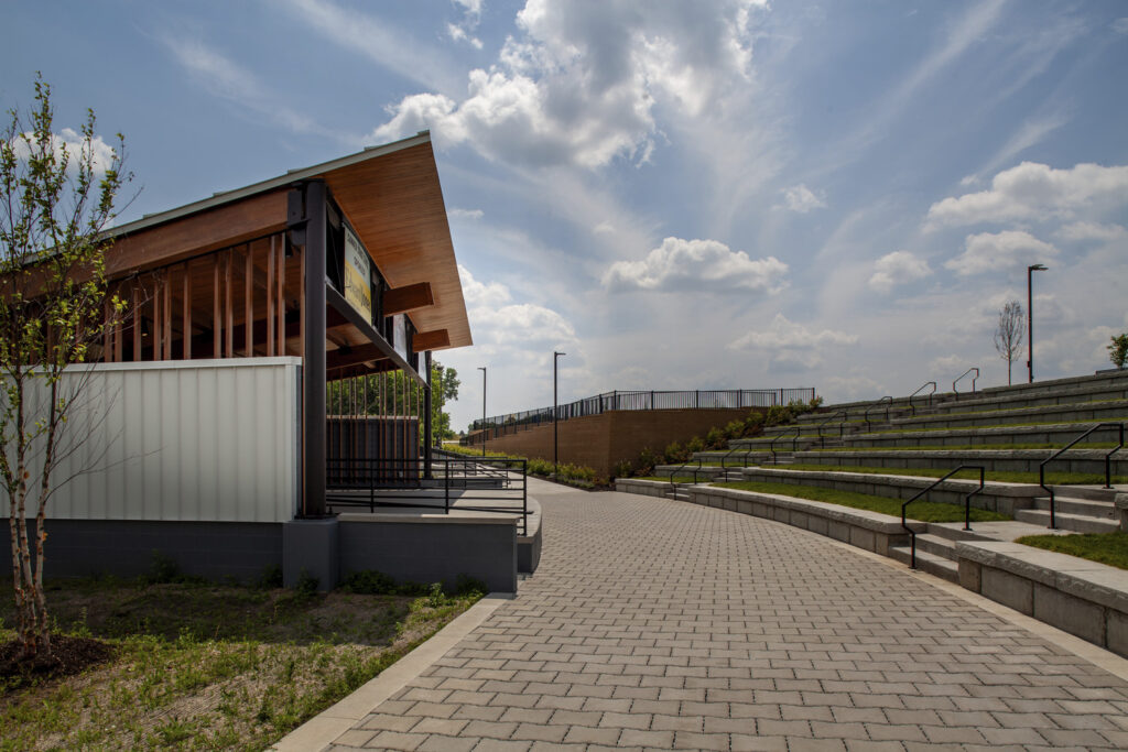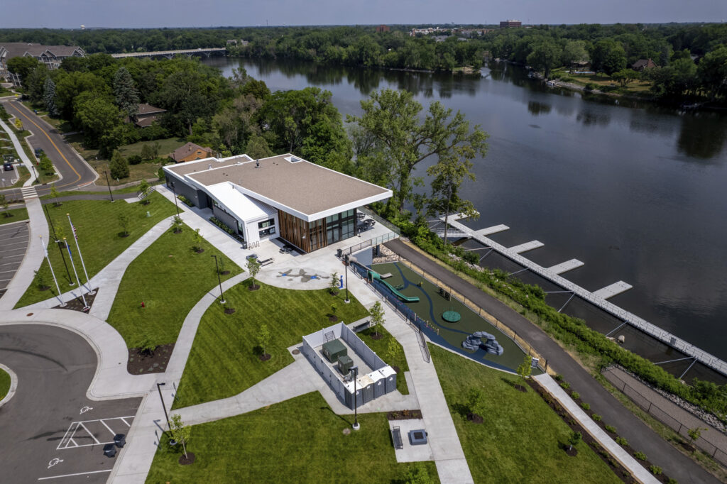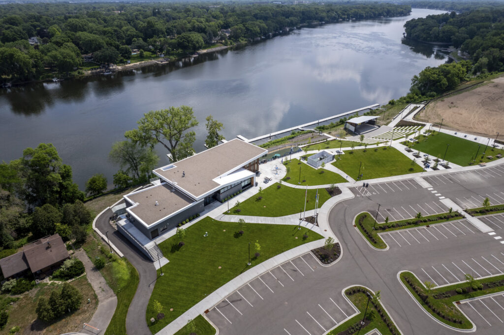 This project was part of a 12-acre development in an area known as Mississippi Crossings. Located along Highway 169 and the Mississippi River in Champlin, Minnesota, this project included construction of two primary areas. An open-air, riverfront amphitheater operates for concerts, outdoor presentations and other community events. A 9,500 sf public pavilion and plaza allows for all-season functionality with private event options. In addition to this, the project consisted of multiple outdoor gas fire pits, a lawn bowling court, a climbing wall playground and a splash pad. A massive floating dock connects the river to the park, which contains dozens of places to tie off your boat to go enjoy the park.