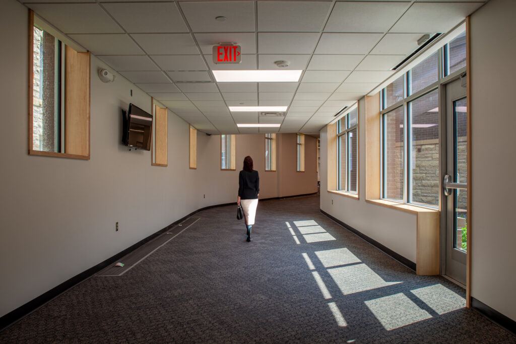 This project created a new security corridor addition to connect the three primary existing academic buildings on the Minnesota State Academy for the Deaf campus. The security corridor now serves as the main entry for the campus and improve safety and security for students, staff and visitors. Adjacent areas were remodeled to include a new administration suite, staff workroom, lunchroom, restrooms and science lab. Additionally, wood shakes were replaced with metal panels and brick on Smith and Quinn Halls, window replacements occurred on Quinn Hall and a lift was added to create an accessible entry on Noyes Hall.