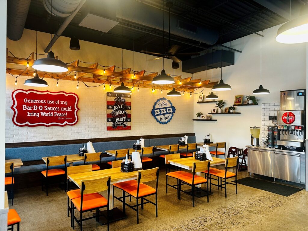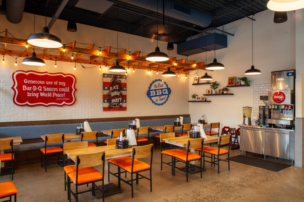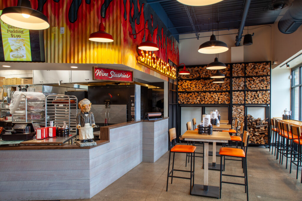 This project involved a full buildout of an existing tenant space, transforming it into a fully equipped, operational food service facility. Work included a welcoming waiting area, dining space, full commercial kitchen with two full-size smokers, a walk-in freezer, storage, POS stations, and an exterior walk-up food pickup window. Roof work included patching after removing old air handling units, installing new units, and adding a condenser for the walk-in fridge. The space previously operated as another fast-casual restaurant with only a prep area, so all mechanical and electrical systems were upgraded to support full kitchen operations. Longer lead times on air handling units required careful scheduling to maintain project momentum.