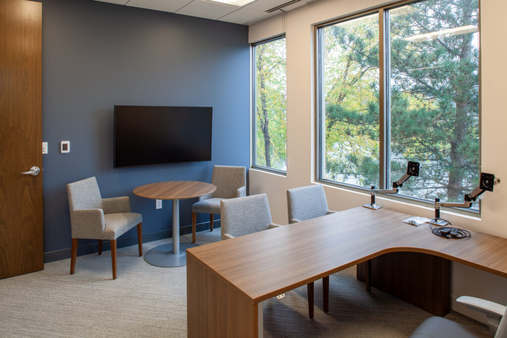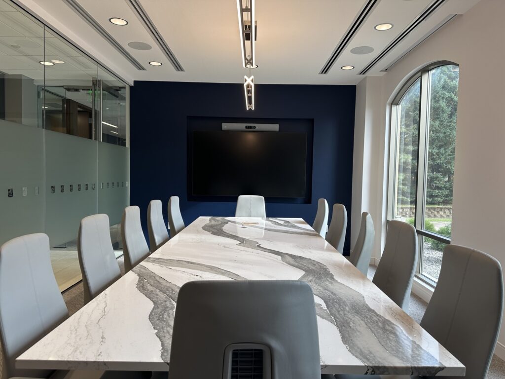 This project involved a complete gut and build-out of the entire first floor of a multi-tenant building in Lilydale, creating a modern, fully functional office space for a relocating tenant from downtown St. Paul. The renovation included private offices, two conference rooms, men’s and women’s restrooms, a kitchen, breakroom, and a mother’s room. Conference rooms were finished with custom Acoustibuilt ceilings, installed as 4' x 6' panels over plywood, with seams filled five times and sprayed with seven to nine coats of fine texture, allowing each layer to dry in between. Careful sequencing ensured light diffusers were installed before texturing, preventing rework and achieving a seamless, high-quality finish throughout the space.
